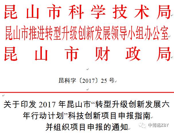 关于印发2017年昆山市“转型升级创新发展六年行动计划”科技创新项目申报指南并组织项目申报的通知